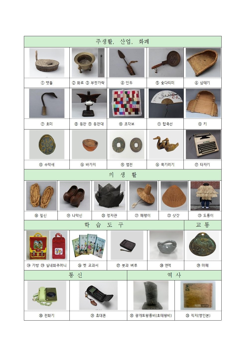 90년대 휴대폰, 타자기, 다이얼 전화기, 맷돌, 화로 엽전, 60~70년대 교과서 등 33종으로 구성됐다.