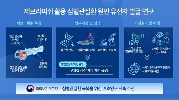 [충청25시] 국립보건연구원은 제브라피쉬 동물모델을 활용해 유전성 심혈관질환의 원인이 되는 유전자를 찾고, 질환이 생기는 과정을 밝히는 연구를 수행하고 있다.