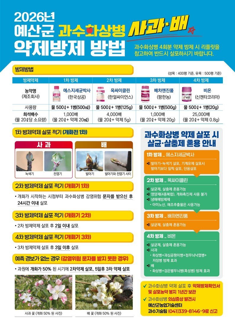 또한 농업기술센터는 ‘2026년 사과 방제력 및 화상병 약제 살포 시기 안내’홍보물을 함께 배부해 농가의 예방 활동을 적극 지원할 계획이다.