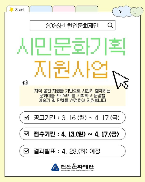 [충청25시] 천안문화재단은 다음달 13~ 17일 ‘시민문화기획 지원사업’참여 예술가를 모집한다고 16일 밝혔다.