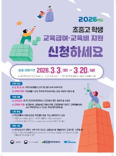 [충청25시] 아산시는 저소득 가구 학생의 교육기회 보장을 위해 2026년 교육급여 및 초 중 고 교육비 지원사업 집중 신청기간을 3월 3일부터 3월 20일까지 운영한다.