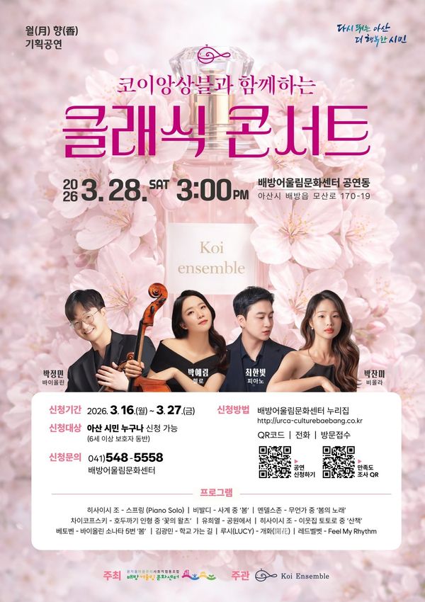 [충청25시] 아산시 배방어울림문화센터는 오는 3월 28일 오후 3시, 공연동에서 청년 음악가들로 구성된 ‘코이앙상블’의 클래식 콘서트를 개최한다고 밝혔다.