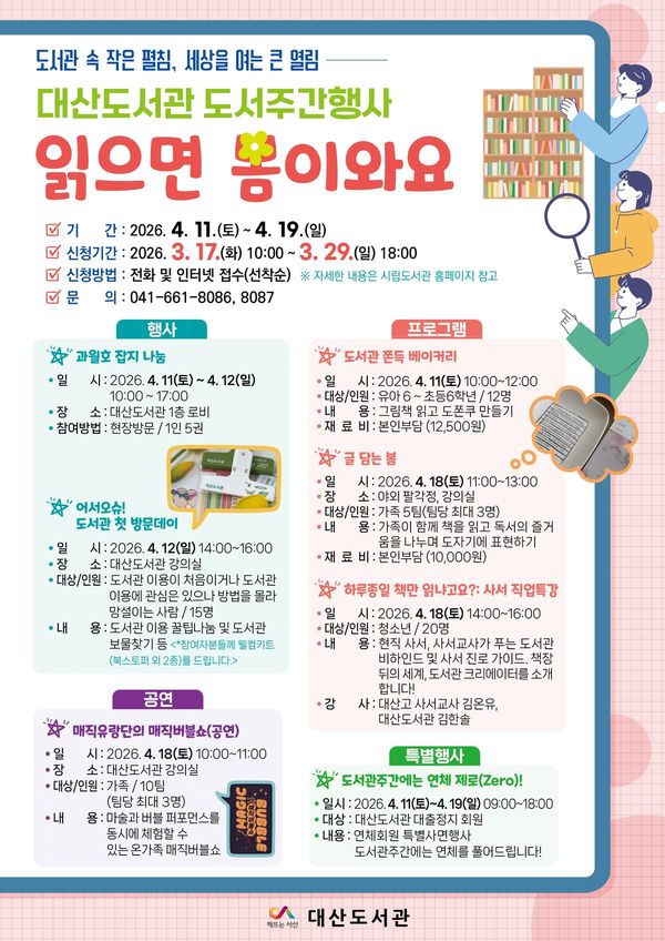 서산시대산도서관, 도서관주간 행사‘읽으면 봄이 와요’ 수강생 모집 (서산시 제공)