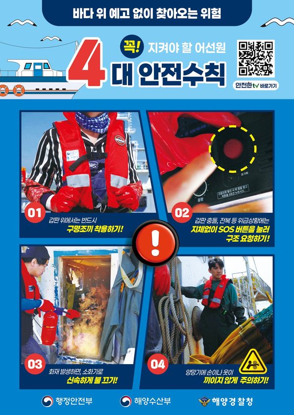 황순조 사회재난대응국장은 “봄철 바다는 잦은 안개로 인해 어선 충돌 위험이 높으므로 조업 시 각별한 주의가 필요하다”라며 “어업인 여러분께서는 안전한 조업을 위해 구명조끼 착용, 위치발신장치 상시 작동 등 안전수칙을 꼭 지켜주시길 바란다”라고 당부했다.
