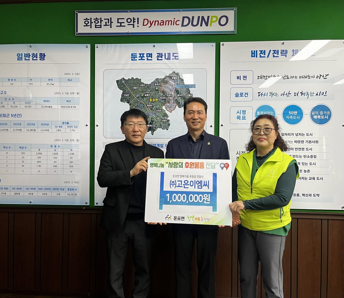 [충청25시] 고은이엠씨는 지난 17일 아산시 둔포면 행복키움추진단을 찾아 어려운 이웃을 위한 후원금 100만원을 전달했다.