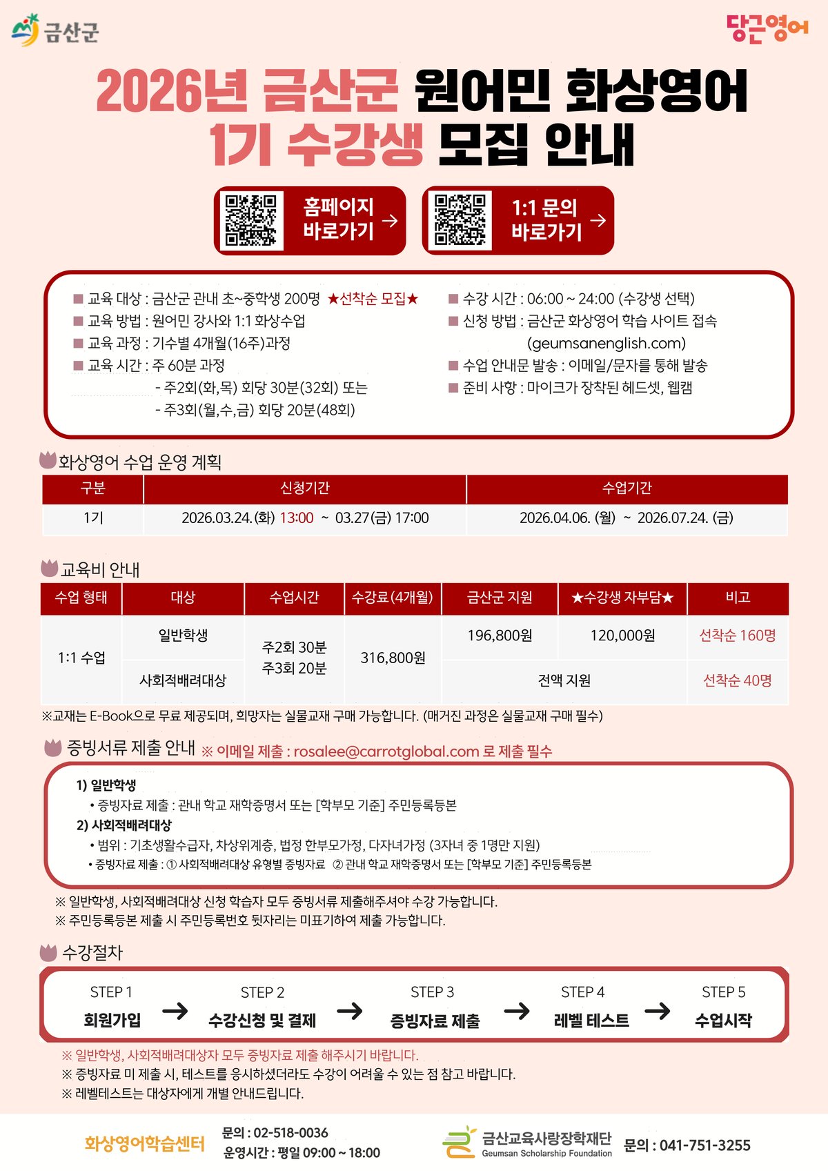 [충청25시] 금산군은 글로벌 인재양성 및 영어사교육비 절감을 위해 3월 24일부터 27일까지 원어민 화상영어 교육 제1기 수강생 200명을 모집한다.