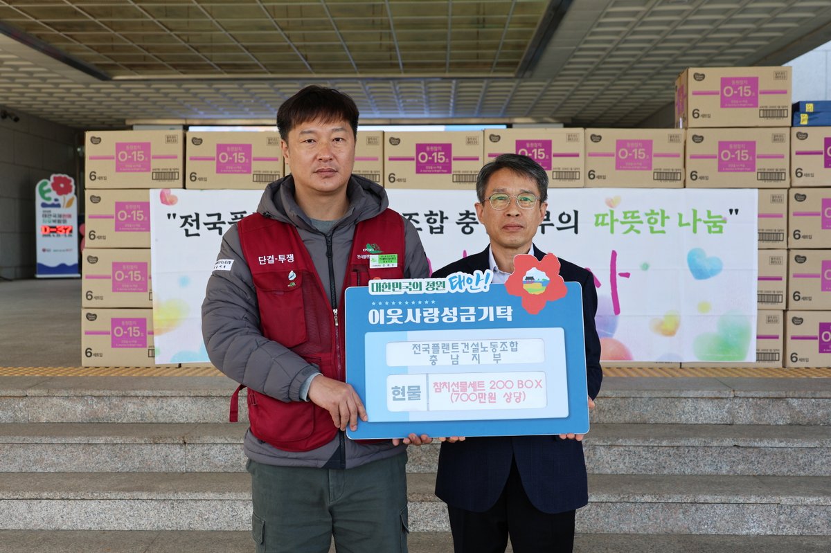 전국플랜트건설노동조합 충남지부는 지난 19일 군청 현관 앞에서 부군수와 한창 조직국장, 신원욱 조직부장, 문태동 수석부지부장 등 관계자가 참석한 가운데 기탁식을 갖고 700만원 상당의 참치 선물 세트 200박스를 전달했다.