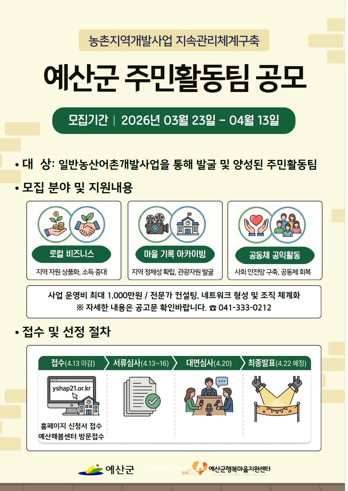 [충청25시] 예산군행복마을지원센터는 주민의 지역개발사업 참여를 확대하고 주민활동팀의 자립체계 구축을 지원하기 위해 ‘농촌지역개발사업 지속관리체계 구축’ 주민활동팀을 4월 13일까지 모집한다고 밝혔다.