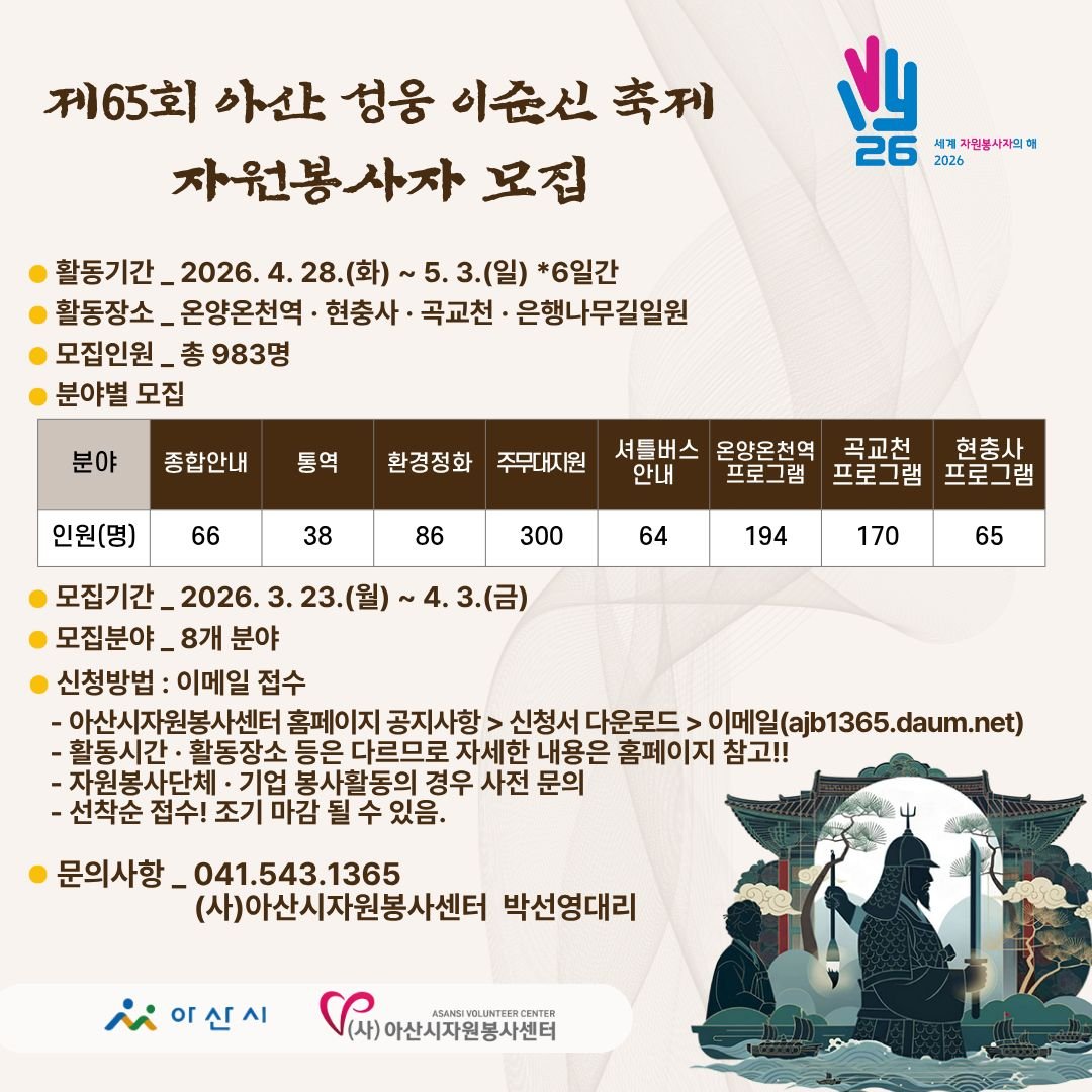 [충청25시] 아산시자원봉사센터는 3월 23일부터 4월 3일까지 ‘제65회 아산 성웅 이순신축제’의 원활한 운영을 위해 자원봉사자 983명을 모집한다고 밝혔다.