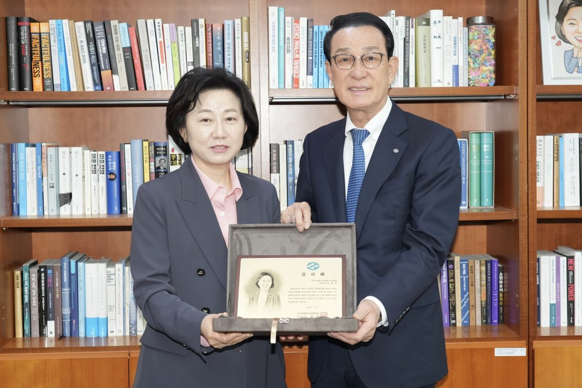 수협중앙회 노동진 회장은 25일 국회 의원회관을 방문해 송 의원에게 직접 감사패를 전달했다.