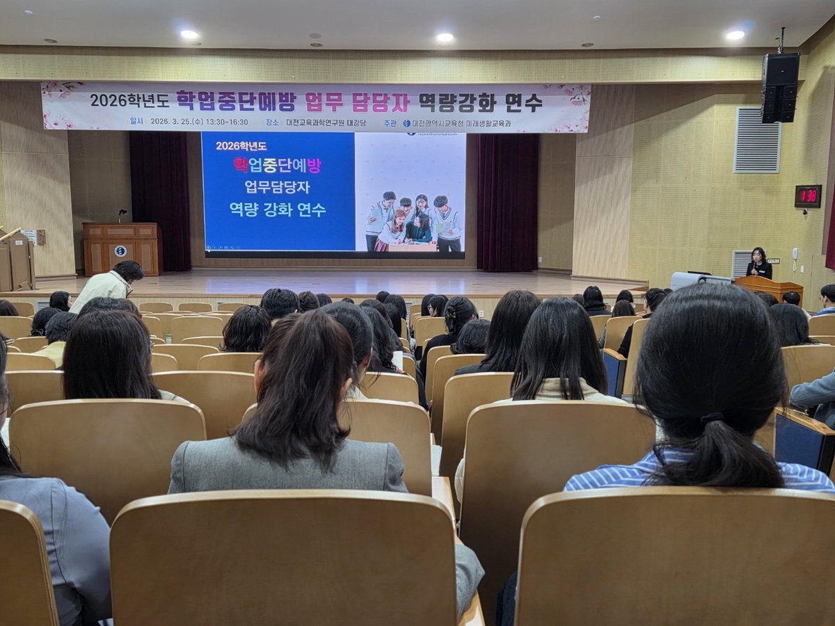 [충청25시] 대전시교육청은 3월 25일 대전교육과학연구원 대강당에서 관내 초 중 고 특수 각종학교의 학업중단예방 업무담당자를 대상으로 ‘2026학년도 학업중단예방 업무담당자 역량강화 연수’를 개최했다고 밝혔다.