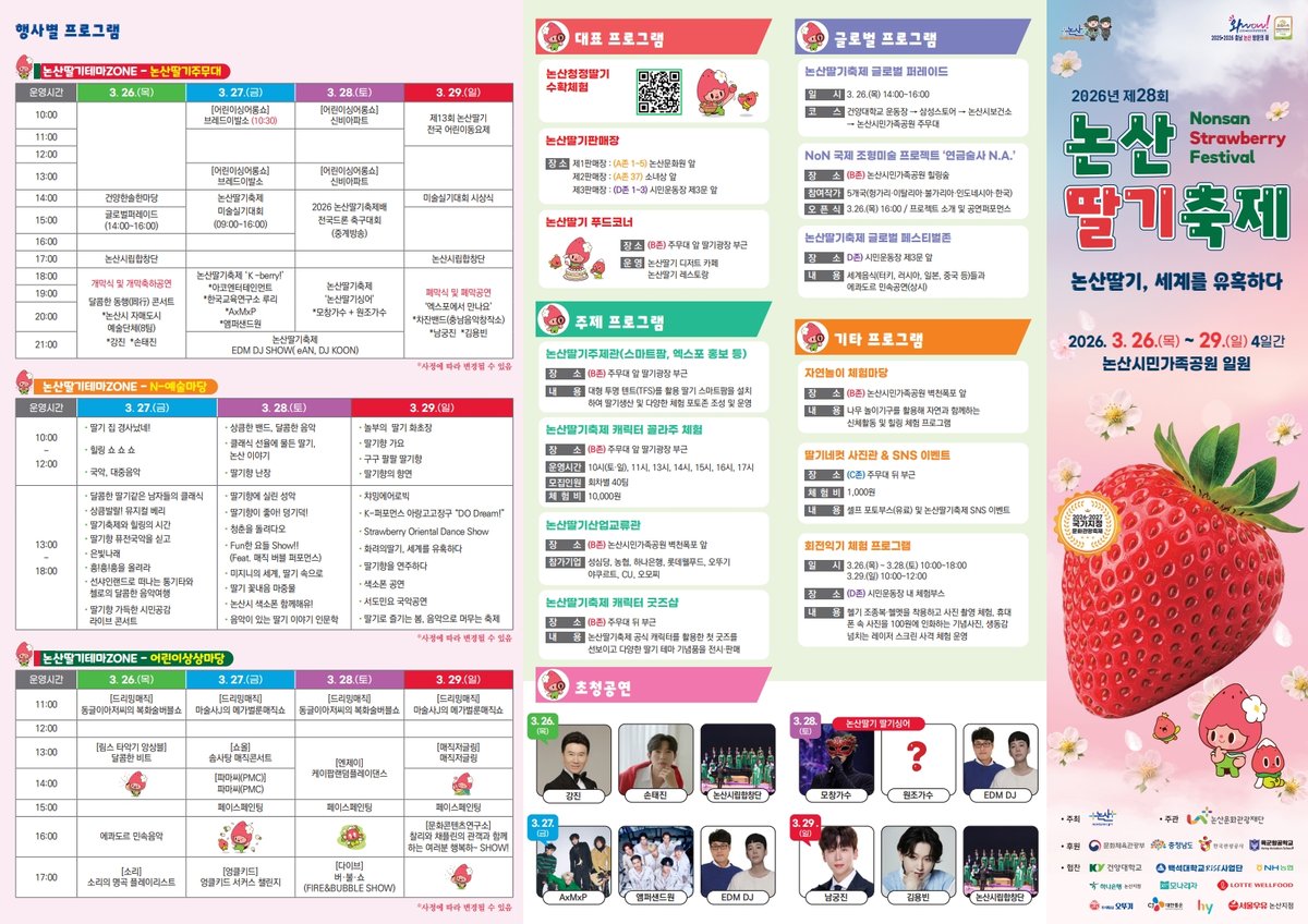 딸기광장 주변에서는 딸기 축제 캐릭터 ‘꼴라주’체험, 논산딸기 스마트팜 기반 주제관, 글로벌 페스티벌존 세계 음식 체험 등 상설 프로그램도 본격 개장한다.