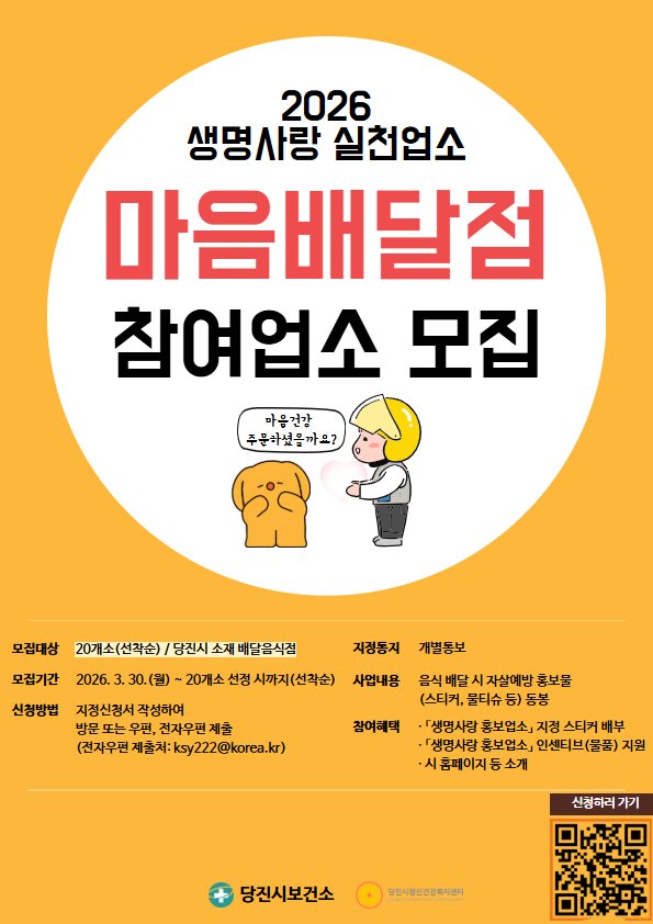 [충청25시] 당진시는 지역사회 내 자살 예방 안전망 구축과 1인 가구의 정신건강 위기 극복을 위해 오는 30일부터 2026년 ‘마음배달점’ 신규 참여 업소를 모집한다고 27일 밝혔다.