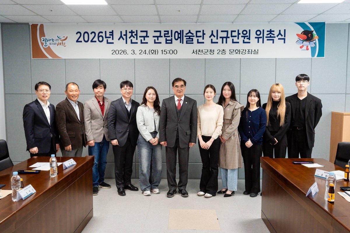 [충청25시] 서천군은 지역 문화예술 진흥과 군민의 문화 향유 기회 확대를 위해 지난 24일 서천군청 2층 문화강좌실에서 군립예술단 단원과 관계자 등이 참석한 가운데 2026년 군립예술단 신규단원 위촉식을 개최했다.