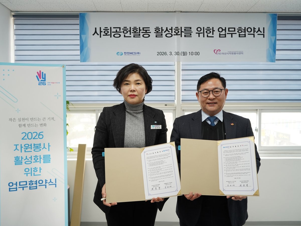 [충청25시] 아산시자원봉사센터와 한전MCS(주) 아산지점은 30일 지역사회 문제 해결과 자원봉사 가치 확산을 위해 업무협약을 체결했다고 밝혔다.