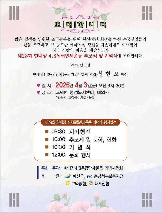 [충청25시] 예산군은 4월 3일 고덕면 한내장터 일원에서 ‘제28회 한내장 4 3 독립만세운동 기념행사’를 개최한다고 밝혔다.