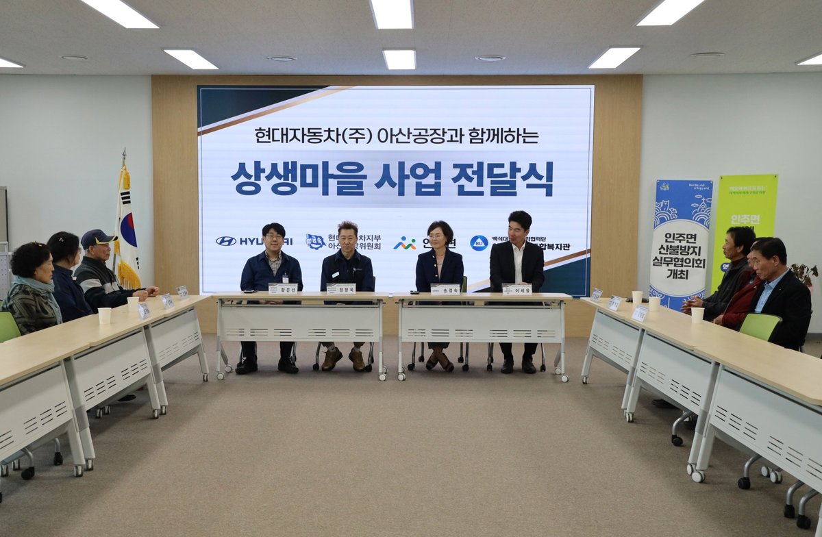 [충청25시] 아산시 인주면은 현대자동차(주) 아산공장, 아산시노인종합복지관과 함께 지역 어르신들의 복지 향상을 위한 상생마을사업 전달식을 개최했다.