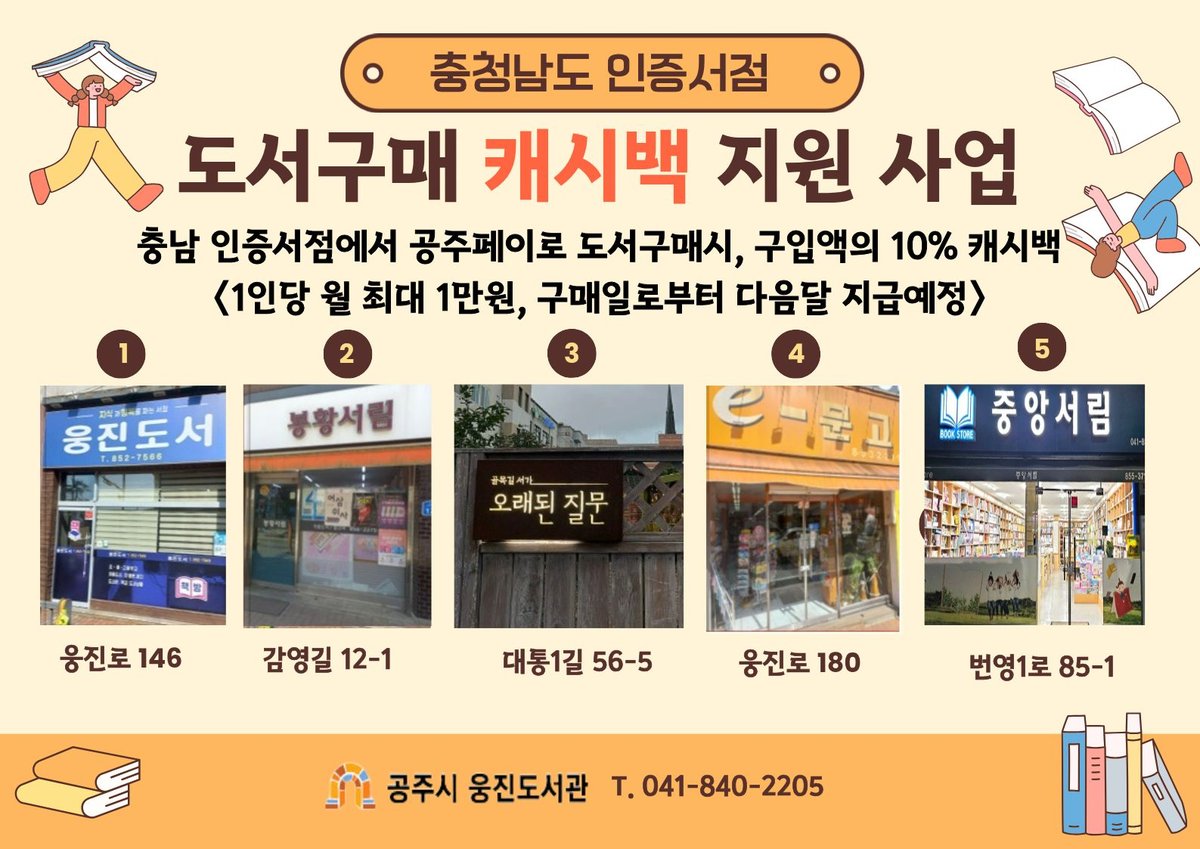 이 사업은 충청남도가 인증한 공주 지역 서점에서 공주페이로 도서를 구매하면 결제 금액의 10%를 공주페이 캐시백 형태로 돌려주는 제도이다.