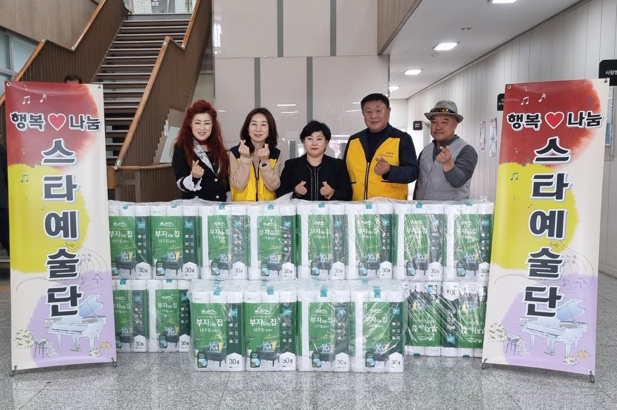 [충청25시] 행복나눔 문화예술봉사회와 스타예술단이 지난 1일 온양6동 행복키움추진단에 휴지 40세트를 전달하며 나눔을 실천했다.