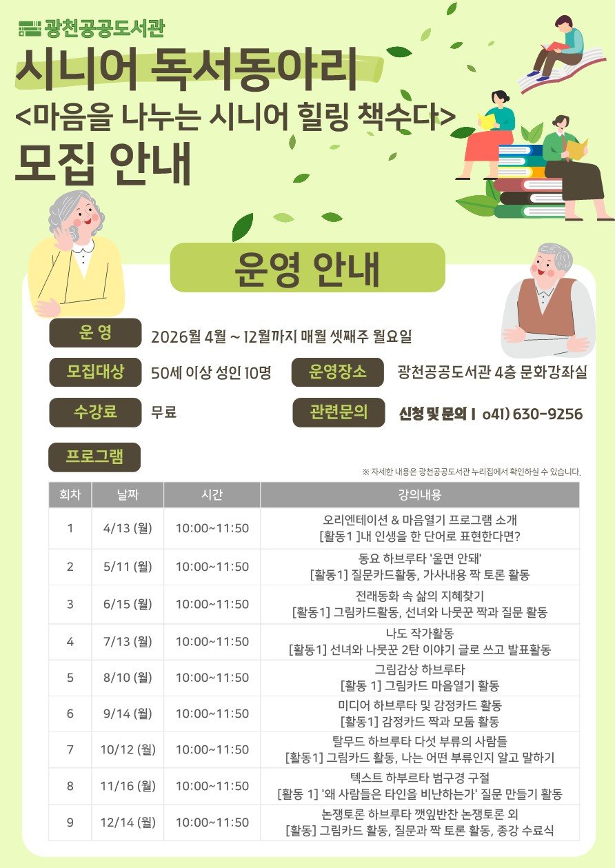 책과 독서에 관심 있는 관내 50세 이상 시니어라면 누구나 신청할 수 있으며 광천공공도서관누리집 프로그램 신청 또는 전화 접수로 신청하면 된다.