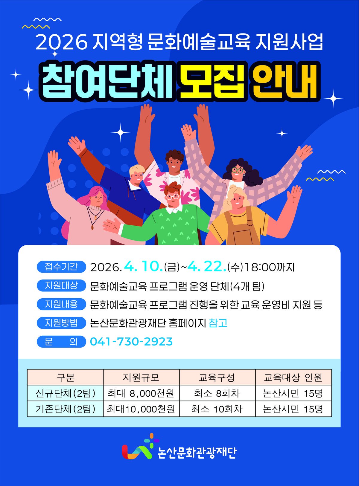 [충청25시] 논산문화관광재단은 지역 문화시설과 자원을 활용한 지속가능한 문화예술교육 기반 구축을 위해 ‘2026 지역형 문화예술교육 지원사업’ 운영단체를 공개 모집한다.