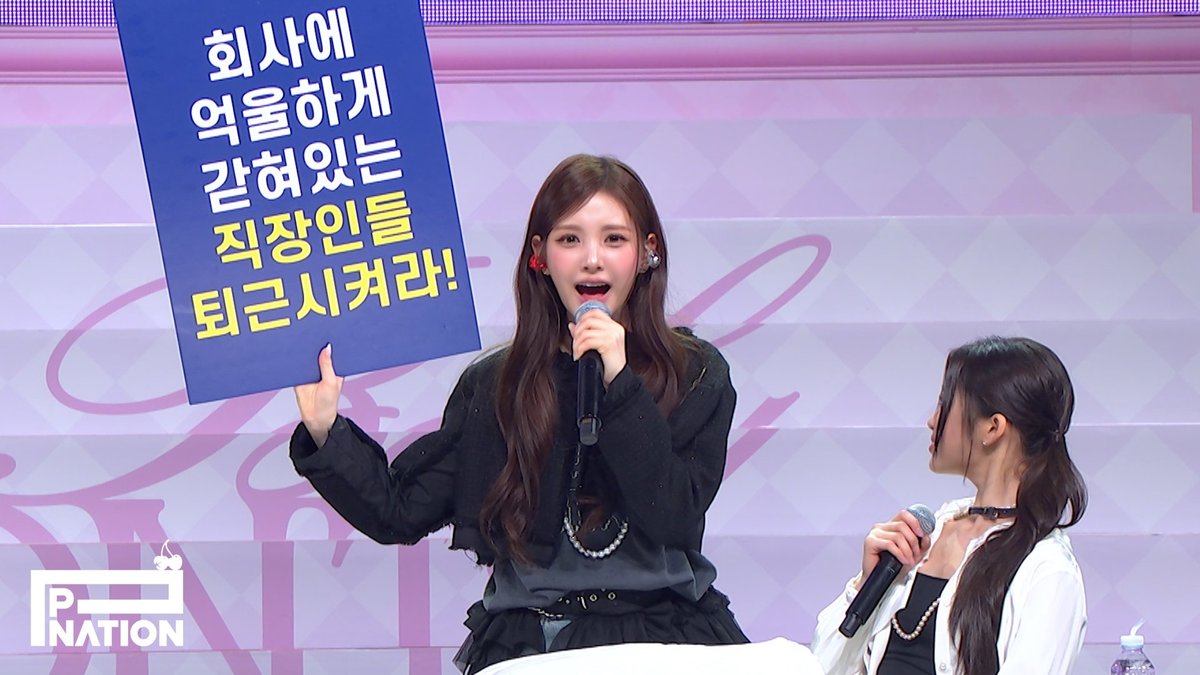 지난달 24일 팬쇼케이스 현장에서 이 문구가 담긴 패널을 들고 당차게 구호를 외치는 모습이 온라인에서 화제를 모았는데, 5일 방송된 ‘인기가요’에서도 오피스룩을 입은 이현이 다시 한번 이 구호를 귀엽게 외쳐 이목을 집중시켰다.