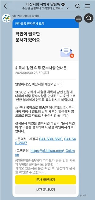 [충청25시] 아산시는 취득세 감면 혜택을 받은 납세자가 준수사항 미숙지로 인해 가산세를 부담하는 사례를 방지하고자 ‘취득세 감면 의무 준수사항 카카오톡 알림톡 서비스’를 운영하고 있다.