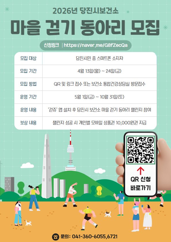 [충청25시] 당진시는 지역 주민의 자발적 걷기운동 실천을 유도하고 주민 주도적 걷기 활성화를 위해 오는 13일부터 24일까지 마을 걷기동아리를 모집한다고 9일 밝혔다.