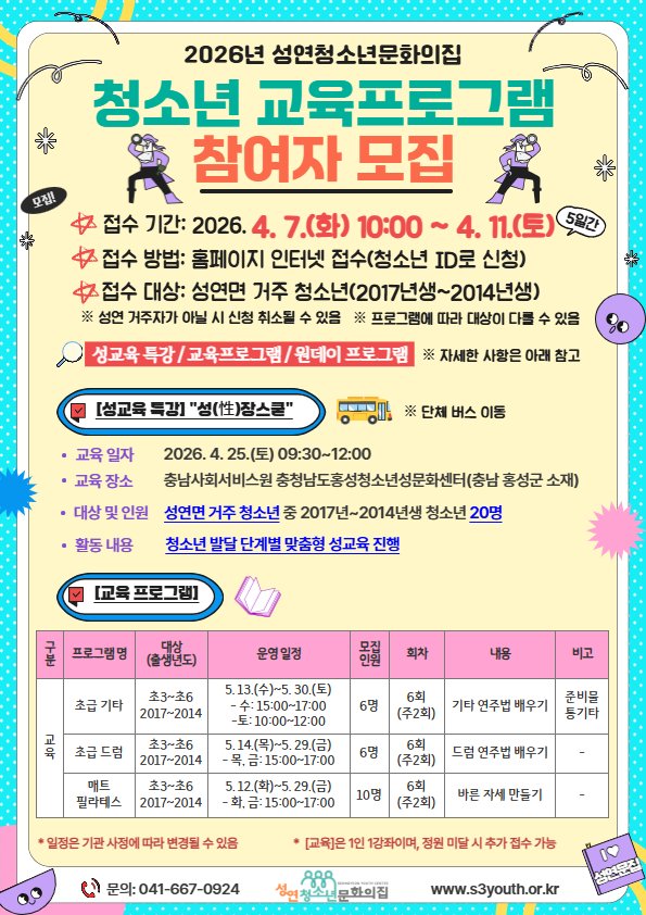 성연청소년문화의집, 2026년 교육프로그램 수강생 모집