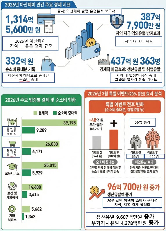 2023년 1월부터 2026년 3월까지 아산페이 누적 결제액은 9734억원이며 이 가운데 순소비 증대액은 2307억원으로 추정됐다.
