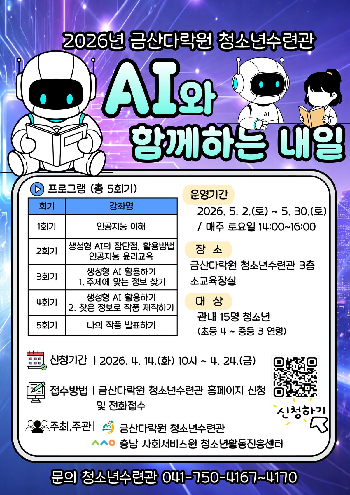 [충청25시] 금산군청소년수련관은 인공지능 체험 교육 프로그램 ‘AI와 함께하는 내일’ 참가자 15명을 4월 14일부터 24일까지 선착순 모집한다.
