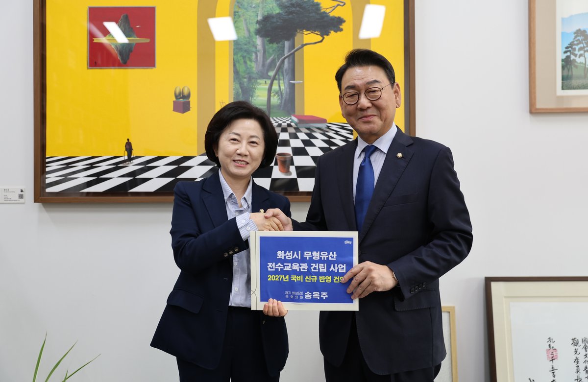 이에 따라 송 의원은 이날 김교흥 국회 문체위원장을 만나 무형유산 전승과 문화유산 보호를 위한 경기 화성 무형유산 전수교육관 건립에 필요한 국비 예산을 2억6400만원을 2027년 국가유산청 예산안에 반영해 줄 것을 건의했다.