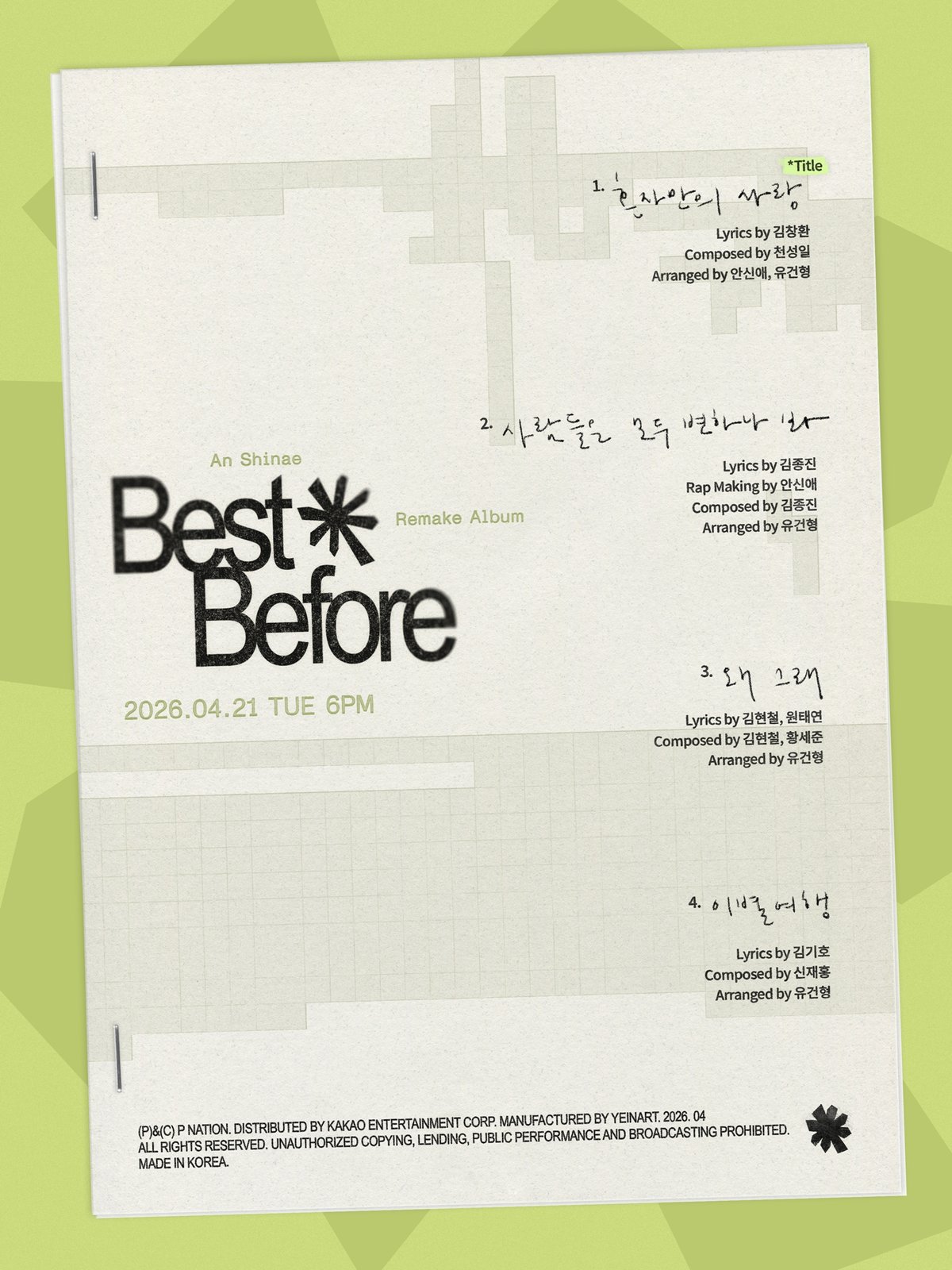 ‘Best Before’는 시간이 흘러도 가요 팬들의 꾸준한 사랑을 받고 있는 명곡을 안신애의 명품 보이스로 재해석한 리메이크 앨범이다.