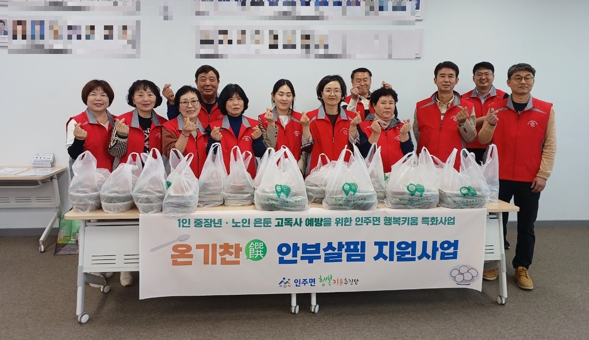 [충청25시] 아산시 인주면 행복키움추진단은 지난 16일 1인 중장년 및 노인 가구의 사회적 고립을 방지하고 고독사를 예방하기 위한 읍면동 특화사업인 ‘온기찬 안부살핌 지원사업’을 실시했다.