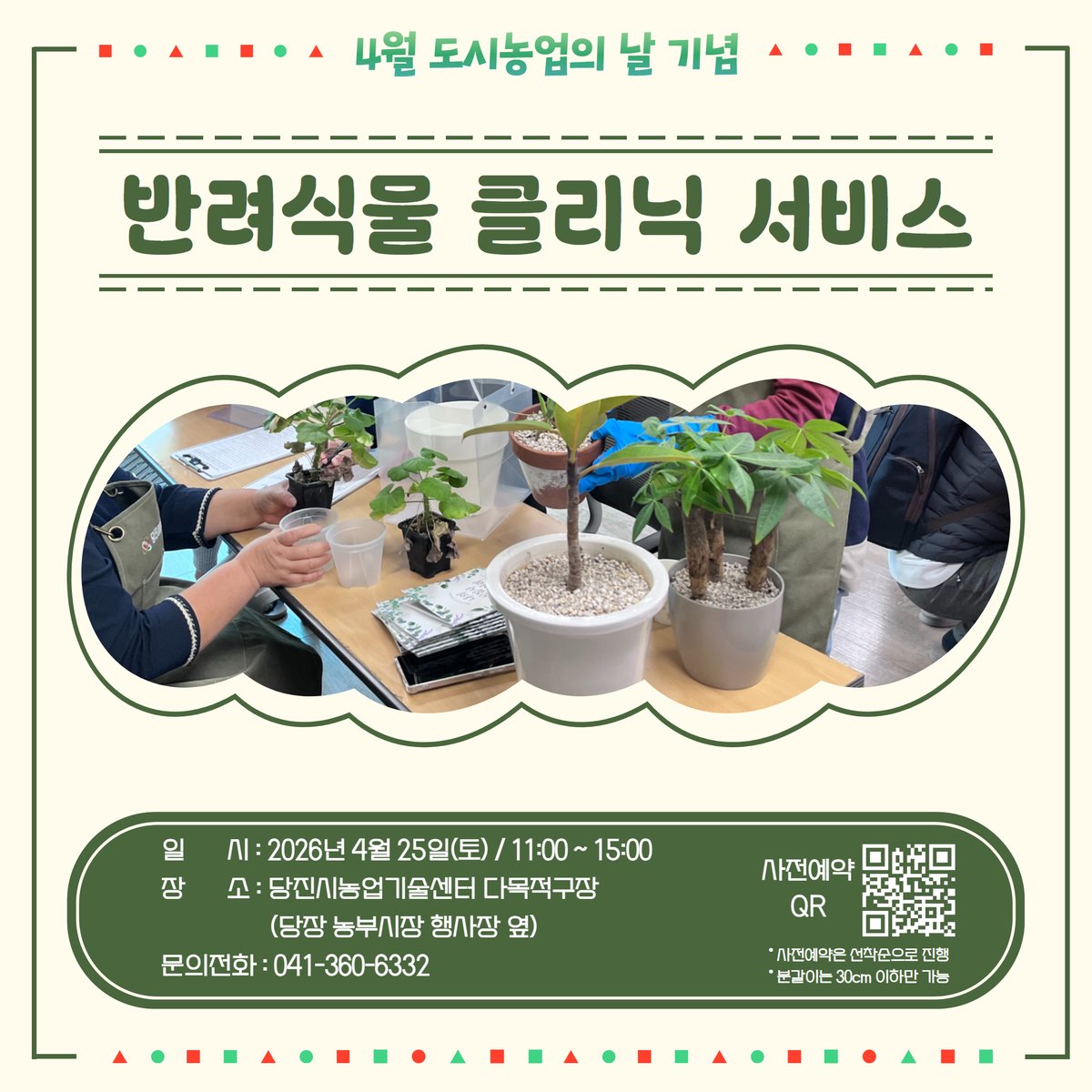 [충청25시] 당진시는 4월 도시농업의 날을 기념하고 도시농업을 널리 알리기 위해 오는 25일 오전 11시부터 오후 3시까지 농업기술센터 다목적구장에서 ‘반려식물 클리닉 서비스’를 운영한다고 17일 밝혔다.
