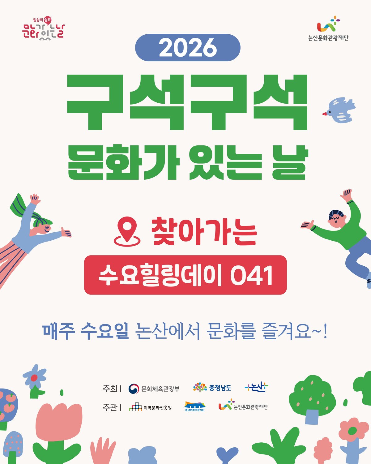 ’문화가 있는 날‘이 매주 수요일로 확대된다.에 따라, 논산시는 군 인프라가 밀집된 지역 특성을 반영해 군부대 및 산업단지 등 문화취약지역을 중심으로 정서 치유형 프로그램과 산업단지 근로자 대상 조직문화 개선 및 소통 프로그램 등 공연·체험형 문화예술 프로그램을 운영해 시민의 문화향유 기회를 넓히고자 한다. 사업은 2026년 4월부터 11월까지 ’문화가 있는 날‘을 중심으로 운영되며 총사업비는 1억 500만원 규모로 추진된다.