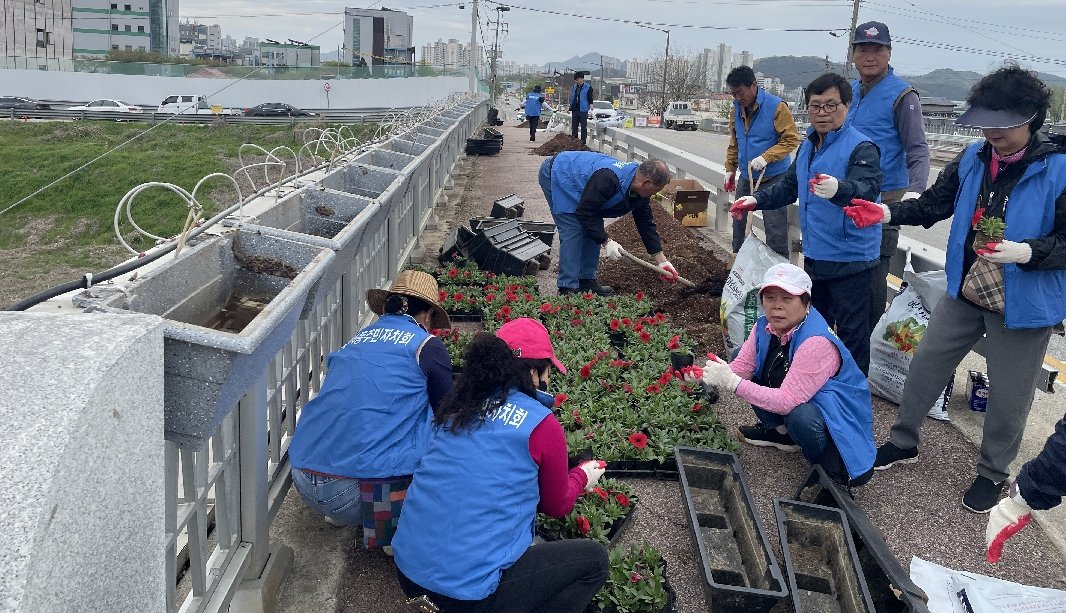 [충청25시] 아산시 온양4동 주민자치회는 지난 17일 민관협력형 사업의 일환으로 실옥교 난간에 봄꽃 식재 활동을 펼쳤다.