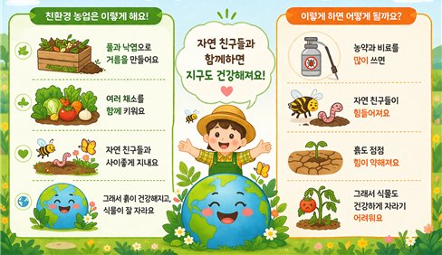 농식품부 이시혜 농산업혁신정책관은 “일상 속 먹거리와 환경의 관계를 쉽고 흥미롭게 이해할 수 있도록 체험 중심의 어린이 교육을 확대하고 있다”며 “앞으로도 친환경농산물에 대한 긍정적인 인식이 확산될 수 있도록 다양한 프로그램을 지속적으로 추진해 나가겠다”고 밝혔다.
