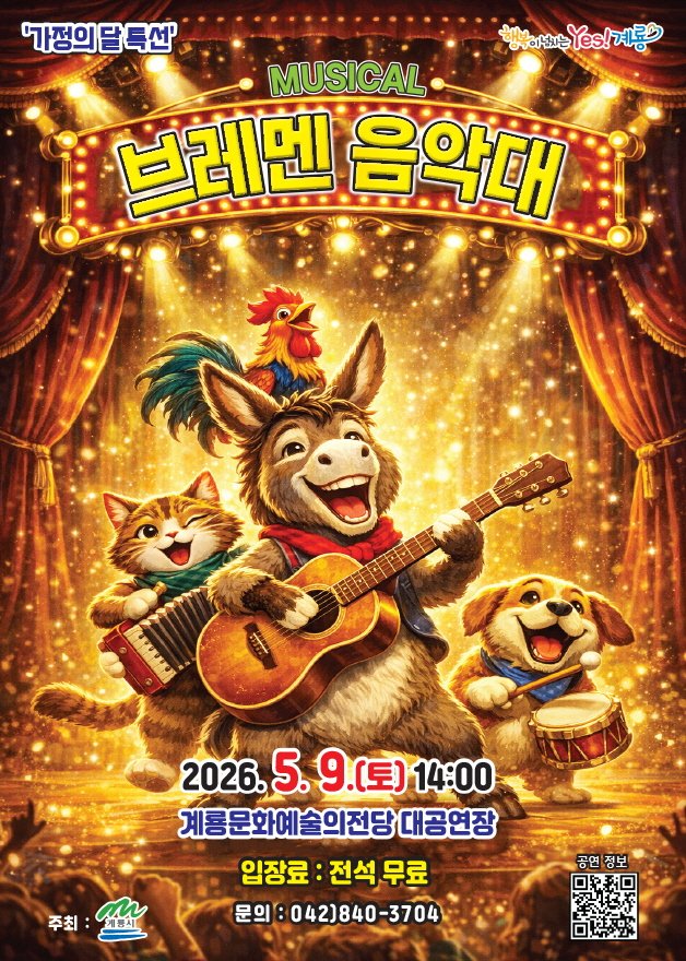 [충청25시] 충남 계룡시는 5월 가정의 달을 맞아 어린이 가족이 함께 즐길 수 있는 기획공연, 가족뮤지컬브레멘 음악대를 오는 5월 9일 오후 2시 계룡문화예술의전당 대공연장에서 선보인다.
