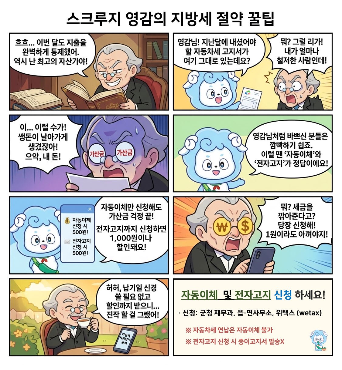 [충청25시] 청양군이 스마트폰 환경에 익숙한 군민들을 위해 친숙한 캐릭터를 활용한 웹툰 ‘스크루지 영감의 지방세 절세 꿀팁’을 제작하고 자동이체 및 전자고지 신청 독려에 나섰다.