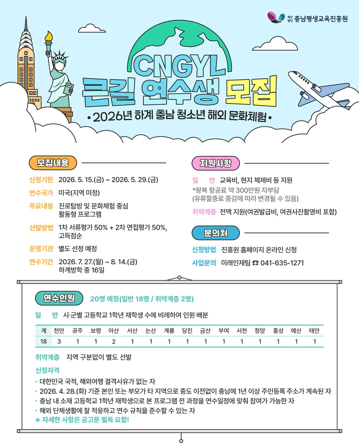 [충청25시] 충남평생교육진흥원은 도내 청소년들이 미국 현지에서 다양한 문화를 체험하고 자신의 진로를 탐색할 수 있도록2026년 충남 청소년 해외 문화체험 큰길 프로그램하계 연수생을 모집한다.