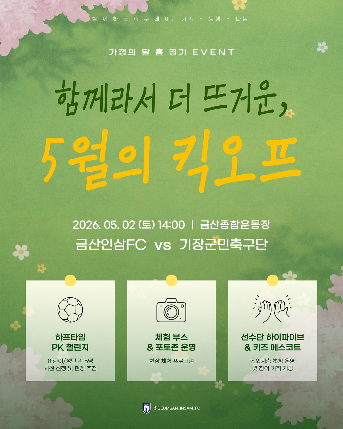 [충청25시] 금산인삼에프씨는 5월 2일 오후 2시 금산종합운동장에서 기장군민축구단을 상대로 2026 케이 4 리그 9라운드 홈경기를 치른다.