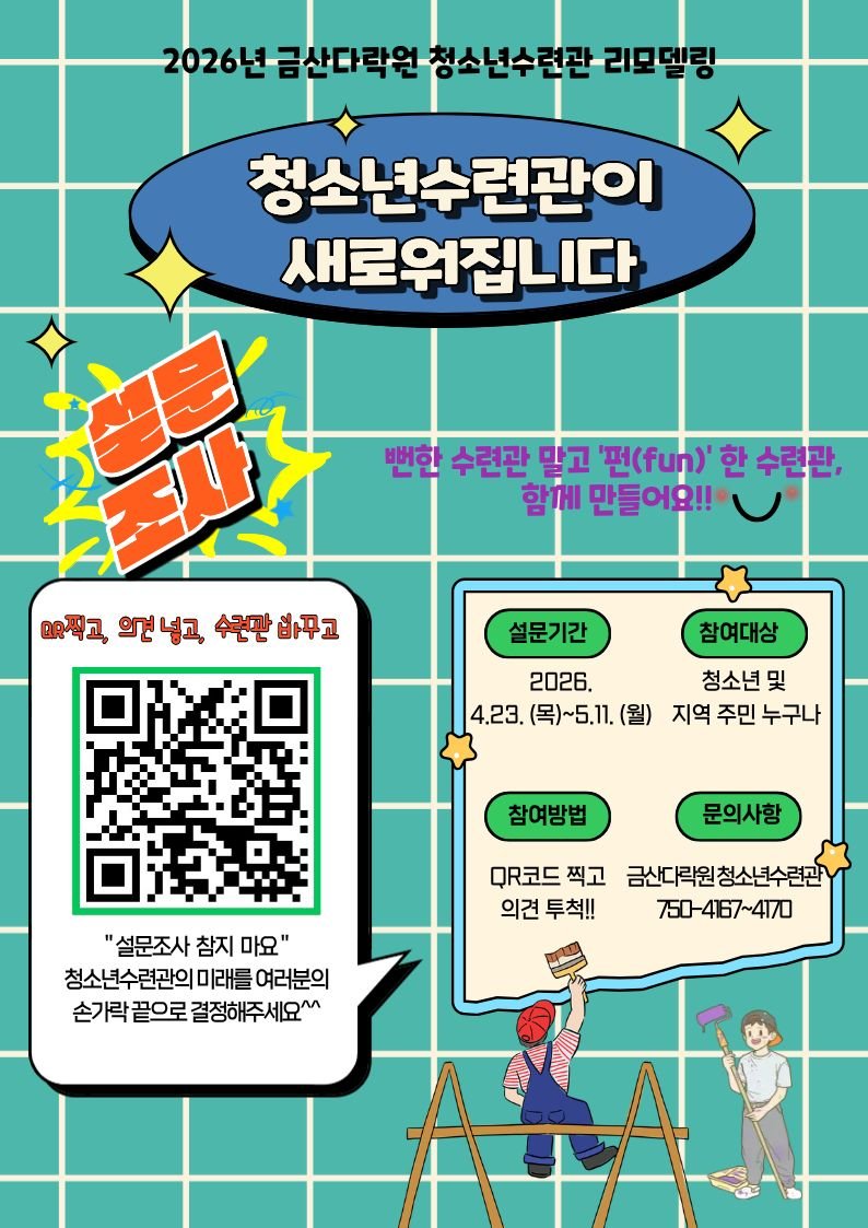 [충청25시] 금산군은 금산군청소년수련관의 시설 개선 및 공간 재구성을 위한 리모델링을 앞두고 5월 11일까지 청소년·군민 의견 수렴에 나섰다.
