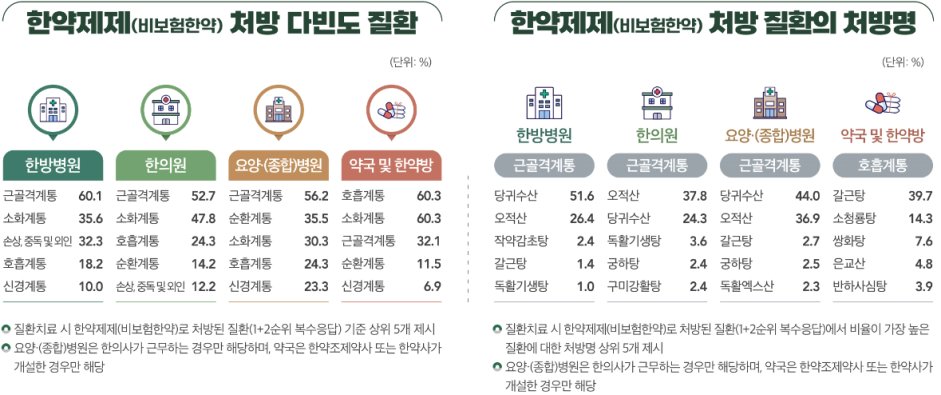 한의원과 한방병원에서 처방한 첩약과 한약제제는 허리·목 통증, 근육통 등 근골격계 질환의 치료를 위한 목적이 가장 큰 이유인 것으로 나타났다.