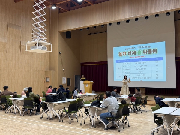 ‘농가 연계 숲나들이 가족캠프’는 숲길을 따라 놀며 쉬며 걷는 달팽이 트레킹과 녹두 월병 만들기 활동을 통해 자연의 소중함을 배우고 가족 간의 소통과 협력의 시간을 가질 수 있는 1박 2일 숙박형 체험 프로그램이다.