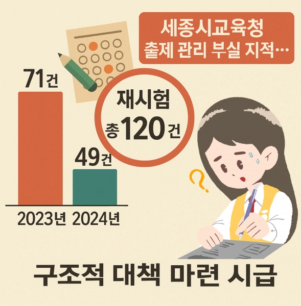 [충청25시] 세종시 관내 중·고등학교에서 최근 2년간 정기고사 재시험 건수가 100건을 넘어선 것으로 집계되면서 시험의 공정성과 신뢰성에 대한 심각한 우려가 제기되고 있다.