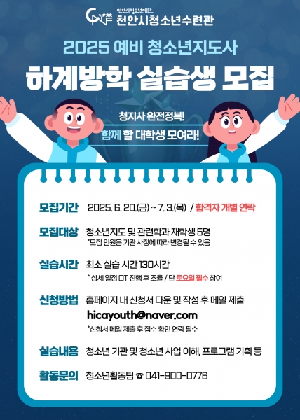 [충청25시] 천안시청소년재단 천안시청소년수련관은 다음달 3일까지 예비 청소년지도사 하계방학 실습생을 모집한다고 12일 밝혔다.