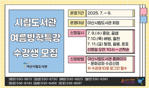 수강 신청은 7월 9일 오전 10시부터 아산시립도서관 누리집을 통해 선착순으로 진행되며 도서관별 신청 일자가 다르므로 미리 확인해야 한다.