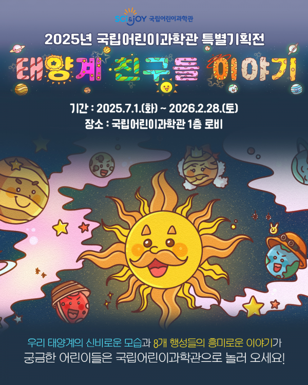 [충청25시] 국립어린이과학관은 우주강국으로 도약하는 대한민국의 어린이들에게 태양 및 8개 행성들의 다양한 특징과 태양계의 신비로운 모습을 어린이들이 좋아하는 이야기로 설명해 우주에 대한 호기심을 자극하고 나아가 우주에 대한 꿈과 희망을 키울 수 있도록 기획한 ‘태양계 친구들 이야기’를 2025년 7월 1일부터 2026년 2월 28일 까지 개최한다.