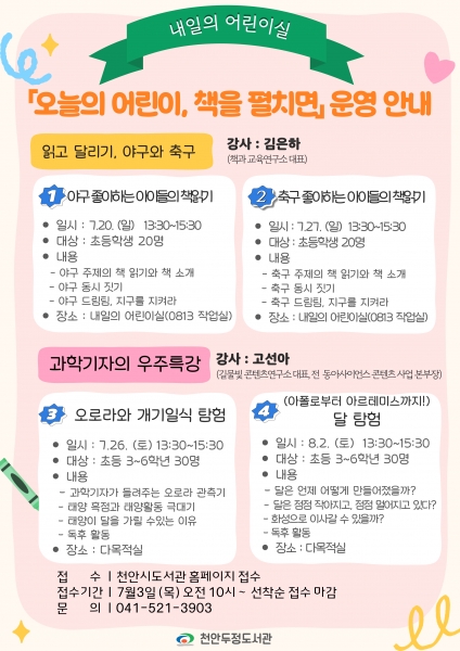 이번 프로그램에는 두정도서관 내일의 어린이실 0813 작업실 큐레이션 서가 조성에 참여했던 인문과학 및 과학 분야 전문가가 참여해 ‘읽고 달리기, 야구와 축구’, ‘ 과학기자의 우주특강’을 진행한다.